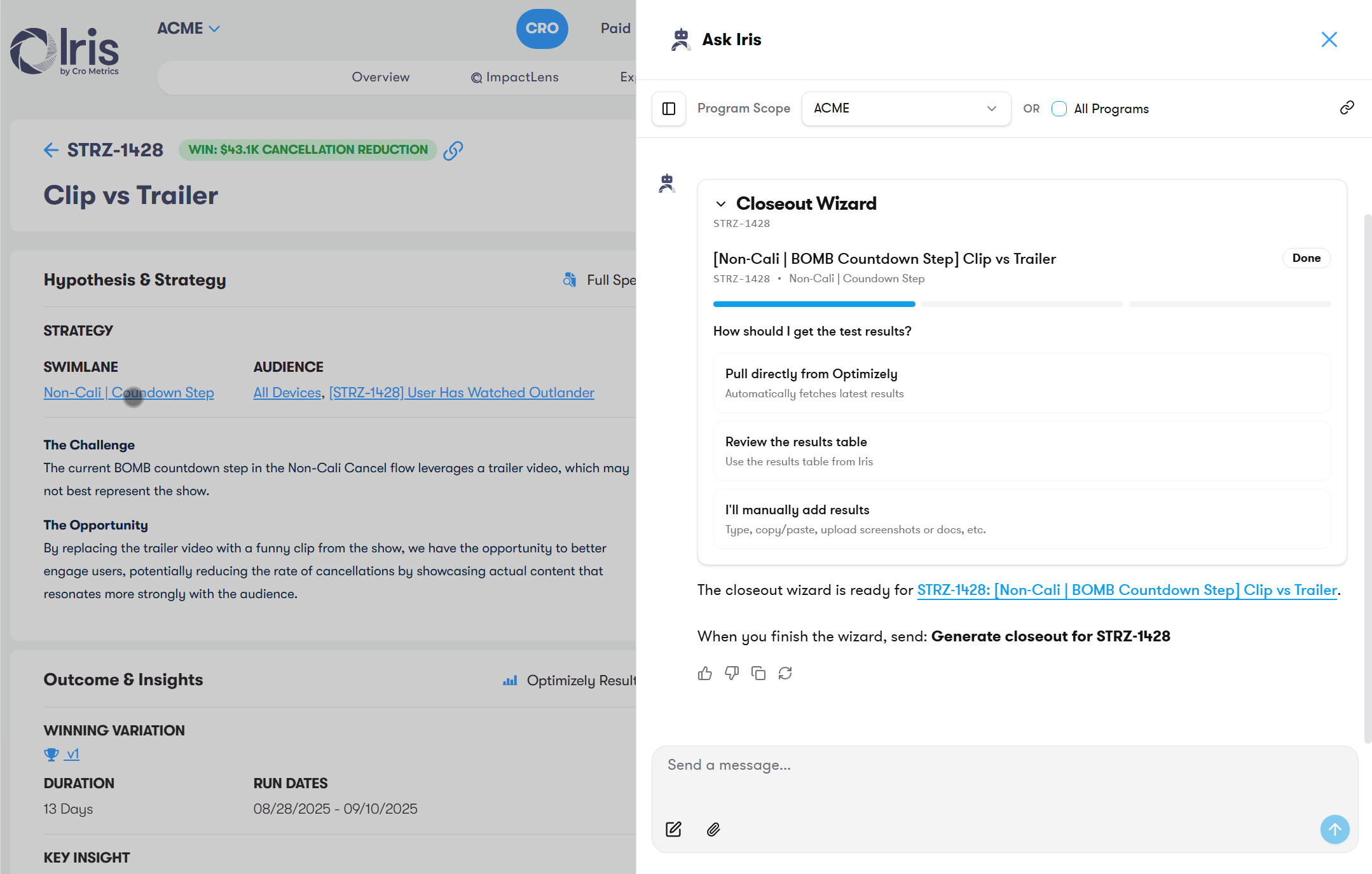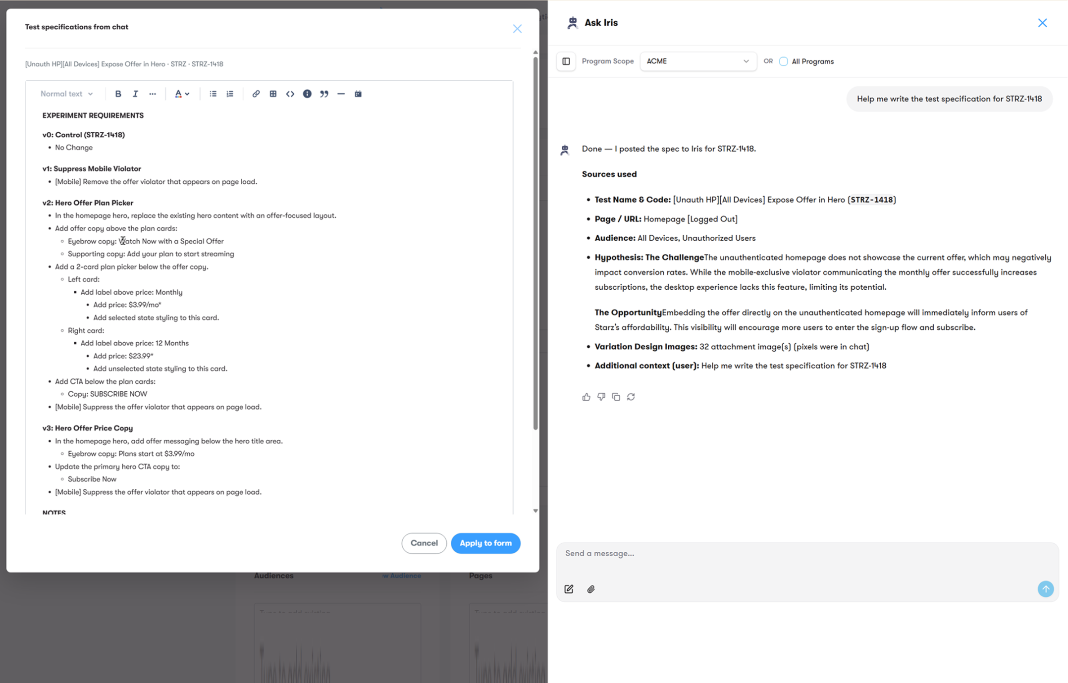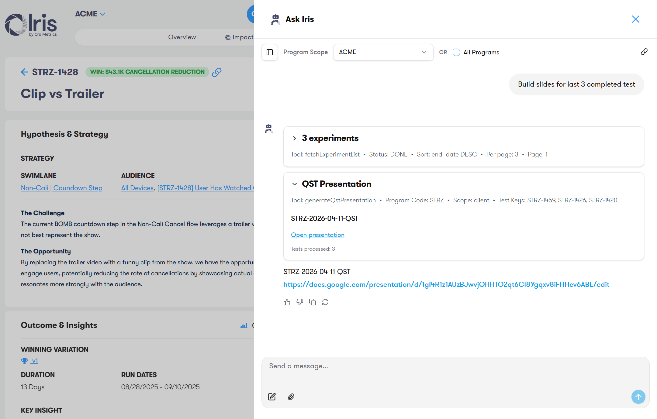 I designed and built Ask Iris — an agentic AI assistant embedded in the Iris platform that doesn't just answer questions about experiments, it runs workflows: writing specs, analyzing results, generating test ideas, and surfacing insights across 12,000+ experiments.